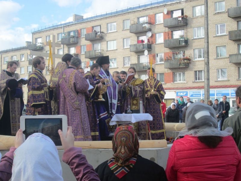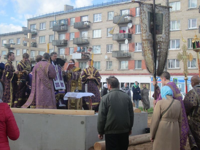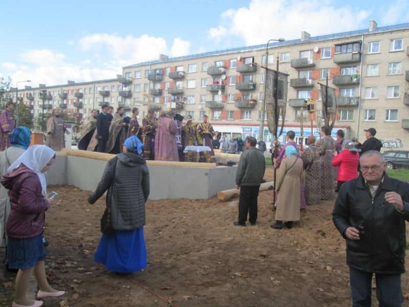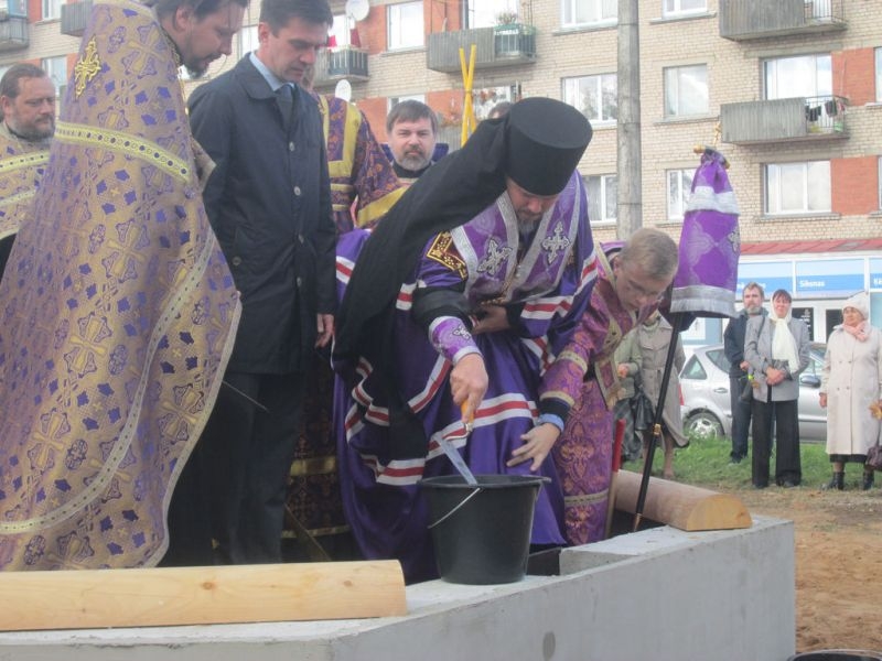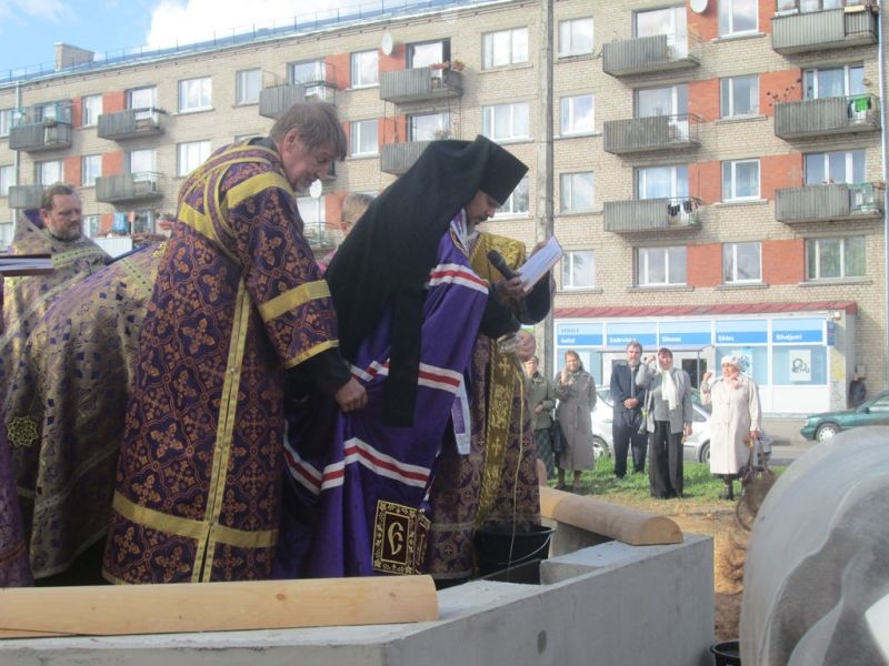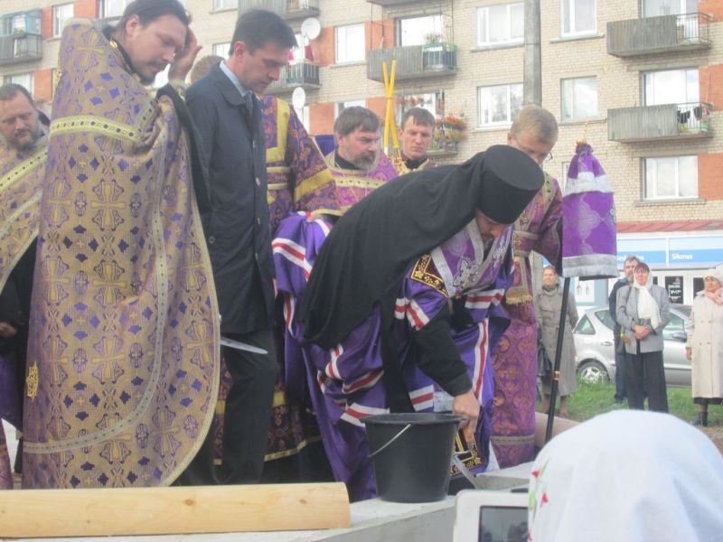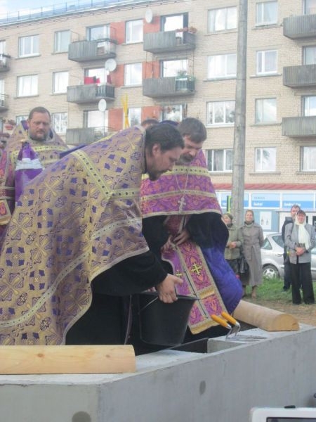 Помолиться об основании нового храма и разделить торжество этого дня собрались верующие города Резекне, большинство – жители Северного района, в котором строится новый храм. Напомним, что несколько лет назад на этом месте стоял маленький храм, принадлежавший ранее греко-католической церкви. По благословению Высокопреосвященнейшего Александра, Митрополита Рижского и всея Латвии, этот храм был выкуплен Синодом Латвийской Православной Церкви, и 3 сентября 2008 года было совершено его мало освящение – начались регулярные богослужения. Храм очень полюбился жителям Северного района города Резекне, стал родным, на богослужения собиралось всё больше народа, и тесный храм уже не вмещал всех верующих, к тому же его конструкция не совсем соответствовала климату наших мест: в крепкие зимние морозы в храме было довольно холодно (а электрическое отопление непомерно дорого), в летнюю жару – душно. Поэтому через три года было принято решение о строительстве нового, более просторного и основательного храма.
