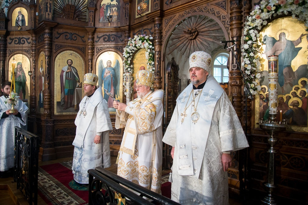 Архипастырям сослужили: благочинный Валмиерского округа, настоятель Свято-Троицкого Задвинского храма г. Риги митрофорный протоиерей Николай Тихомиров; клирик храма Благовещения Пресвятой Богородицы митрофорный протоиерей Иоанн Липшанс; настоятель храма Вознесения Господня г. Риги протоиерей Иоанн Дравантс; клирик кафедрального собора Рождества Христова г. Риги протоиерей Артемий Кучинский; клирик Свято-Троицкого собора г. Риги протодиакон Всеволод Мельников; клирик храма св. блгв. вел. кн. Александра Невского г. Риги диакон Александр Акатов; клирик Свято-Троицкого Задвинского храма г. Риги диакон Гурий Вилциньш. За Божественной литургией в алтаре молился и причащался Св. Христовых Тайн почётный настоятель храма Вознесения Господня г.Риги протоиерей Нил Друваскалнс.