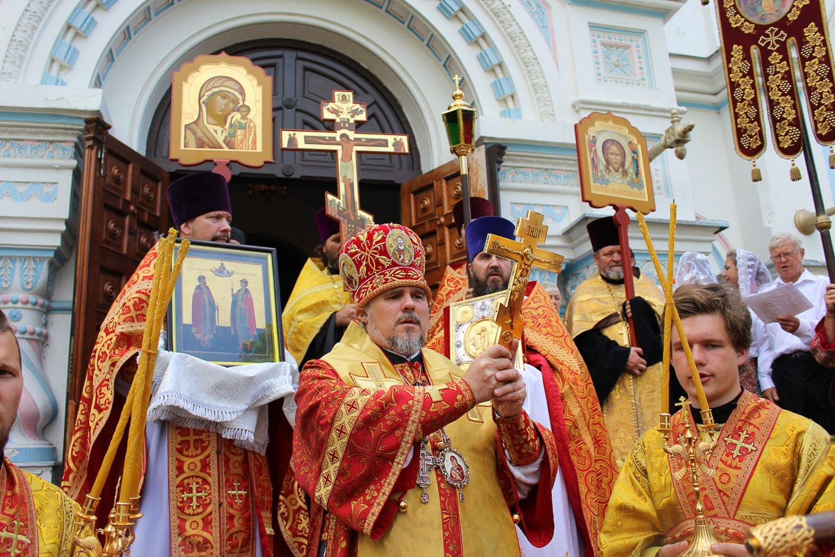 По окончании Божественной литургии состоялся молебен и крестный ход вокруг кафедрального собора. Во время крестного хода Преосвященнейший Владыка кропил верующих святой водой, освящённой этим праздничным утром духовенством собора. Перед входом в храм Его Преосвященство прочёл молитву святым благоверным князьям-мученикам Борису и Глебу и при пении величания приложился к их святому образу.
