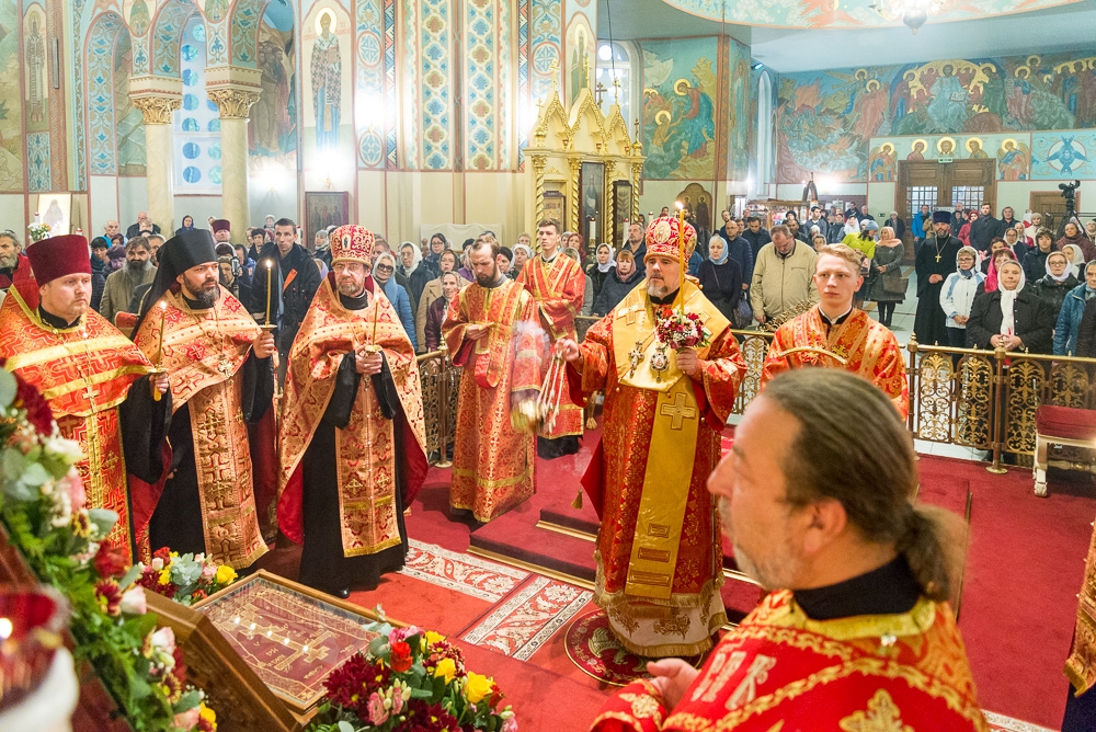 Во время Вечерни Преосвященнейший Владыка совершил литию с освящением хлебов, пшеницы, вина и елея. На Полиелее, во время Утрени, Епископ Александр прочёл Евангелие и совершил помазывание духовенства и верующих освящённым на литии елеем.