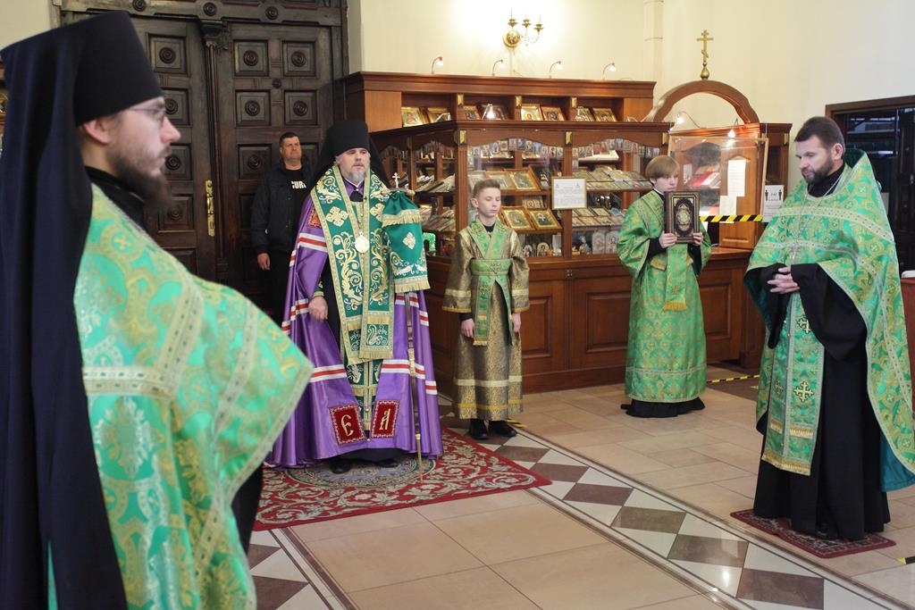 Во время Вечерни Преосвященнейший Владыка совершил литию с освящением хлебов, пшеницы, вина и елея. По прочтении Евангелия на Утрени, Епископ Александр совершил освящение ветвей вербы, символизирующих пальмовые ветви, с которыми встречали Христа в Иерусалиме.