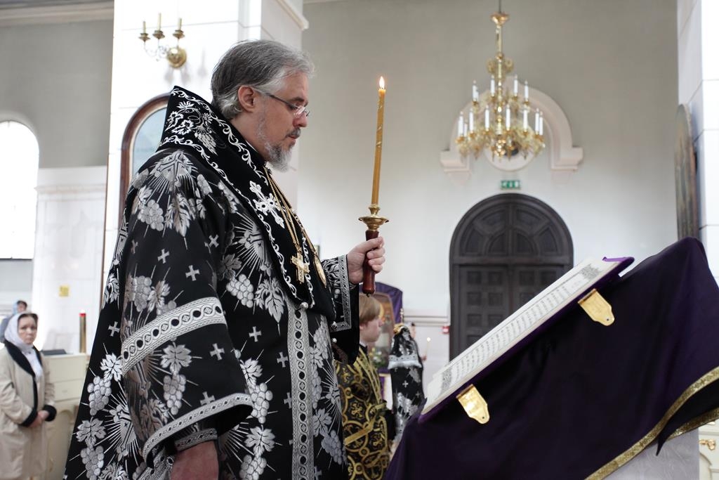 Преосвященнейшему Владыке сослужили клирики Борисо-Глебского собора: и.о. ключаря собора иерей Павел Ткаченко, иерей Георгий Чекушин, иеромонах Александр (Лизон), диакон Роман Смирнов и клирик Рижского Александро-Невского храма диакон Александр Акатов. По традиции Борисо-Глебского собора Евангелие читалось посреди храма перед большим восьмиконечным Крестом с Распятием Спасителя с теплящейся перед ним лампадой.