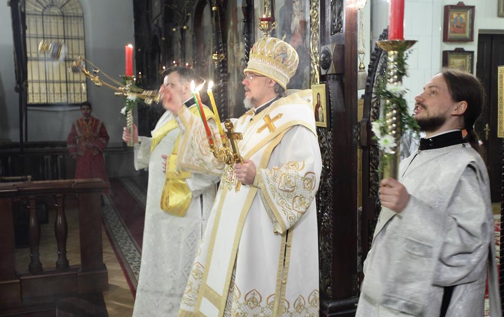 За ночным богослужением Преосвященнейшему Епископу Александру сослужили клирики Борисо-Глебского собора: и.о. ключаря собора иерей Павел Ткаченко, иерей Георгий Чекушин, иеромонах Александр (Лизон), диакон Роман Смирнов, диакон Сергий Меньков, а также клирик храма св. блгв. вел. кн. Александра Невского г. Риги диакон Александр Акатов.