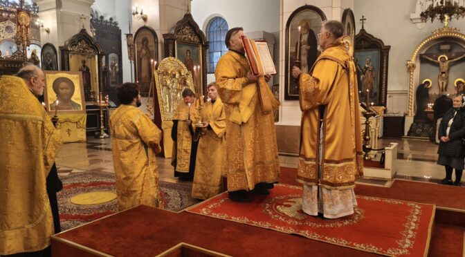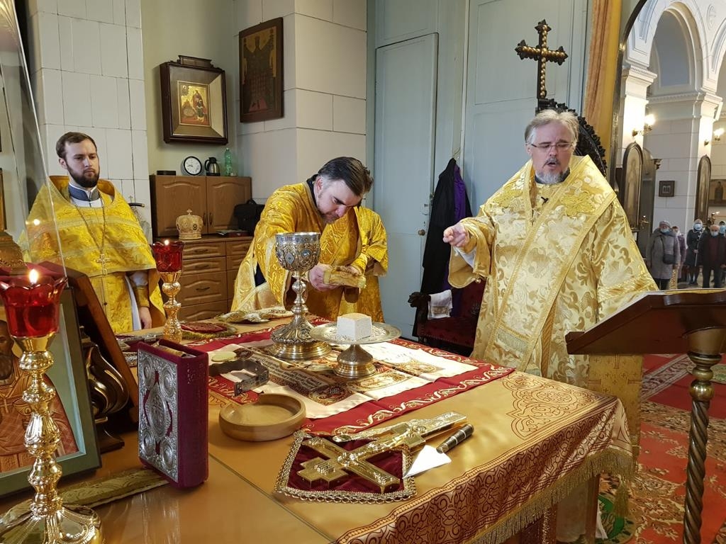 Во время чтения часов Преосвященнейший Епископ Александр молился о своей пастве за проскомидией. За Божественной литургией Епископу Александру сослужили клирики кафедрального собора: и.о. ключаря собора и благочинного Даугавписского округа иерей Павел Ткаченко, иеромонах Александр (Лизон) и диакон Роман Смирнов.