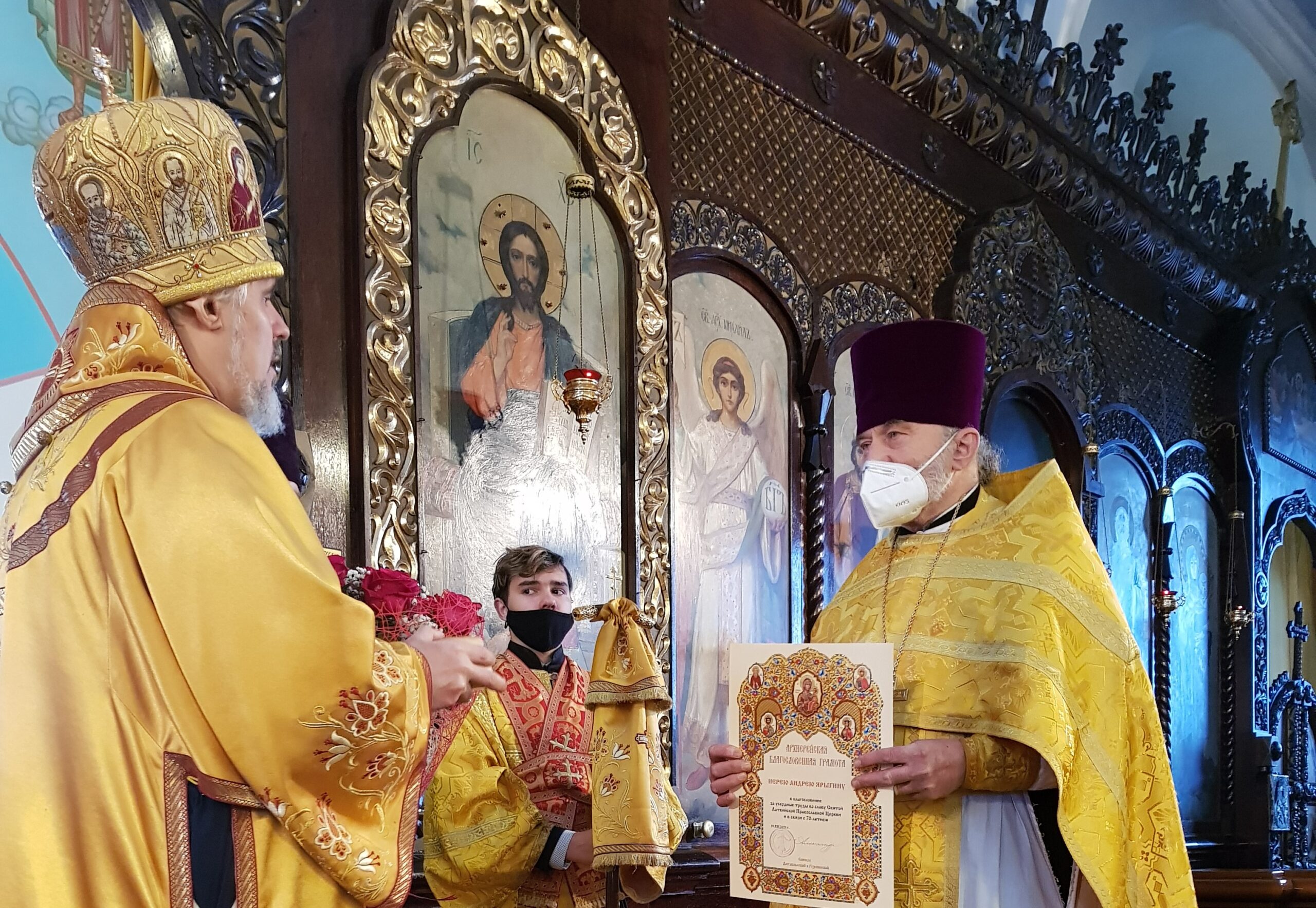 По окончании богослужения Преосвященнейший Владыка за усердные труды во славу Святой Церкви и в связи с 70-летием вручил Архиереской благословенную грамоту иерею Андрею Ярыгину, настоятелю храма Петра и Павла г. Даугавпилса.