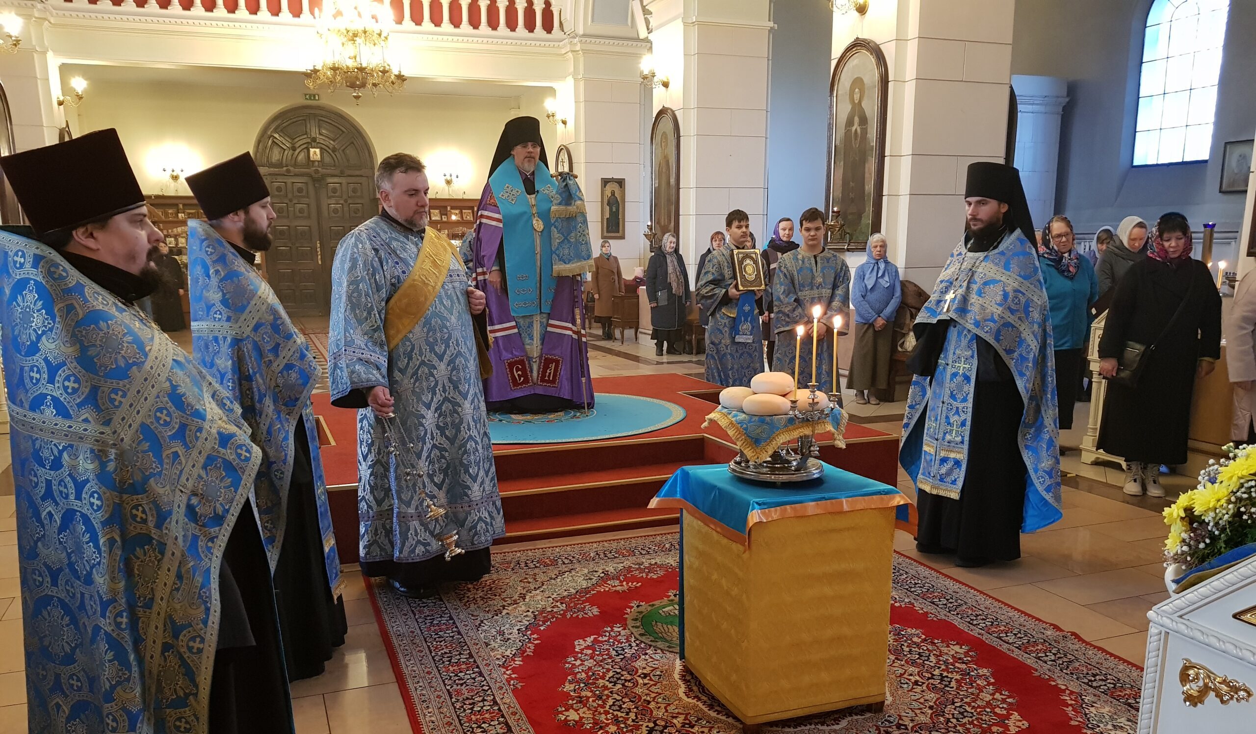 За богослужением Преосвященнейший Владыка совершил литию с освящением хлебов, пшеницы, вина и елея.