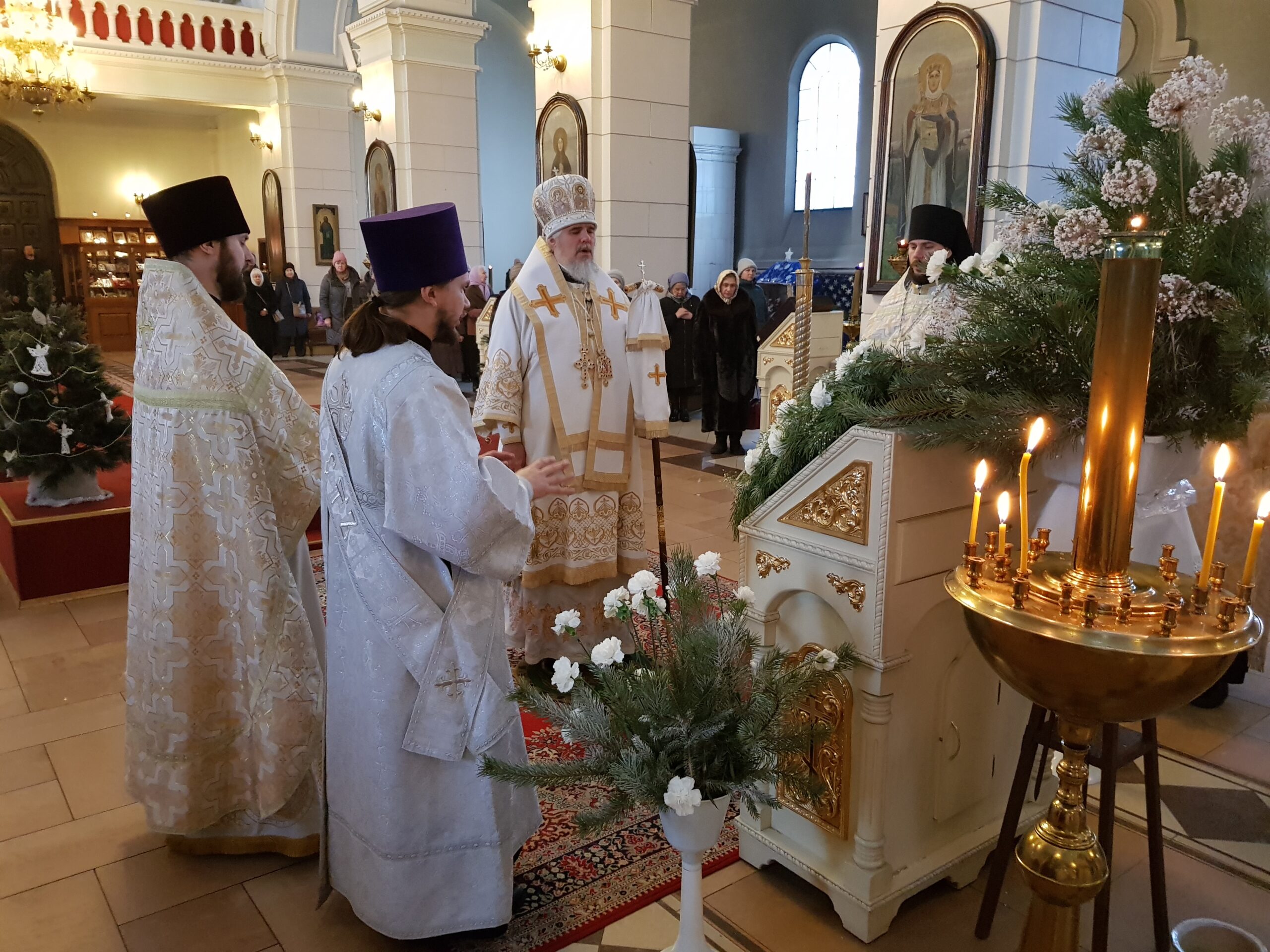 По окончании богослужения духовенство во главе с Высокопреосвященнейшим Архиепископом Александром перед праздничной иконой и рождественской свечой, знаменующей Вифлеемскую звезду, совершили славление, пропев тропарь и кондак Рождеству Христову. Затем было провозглашено уставное многолетие.