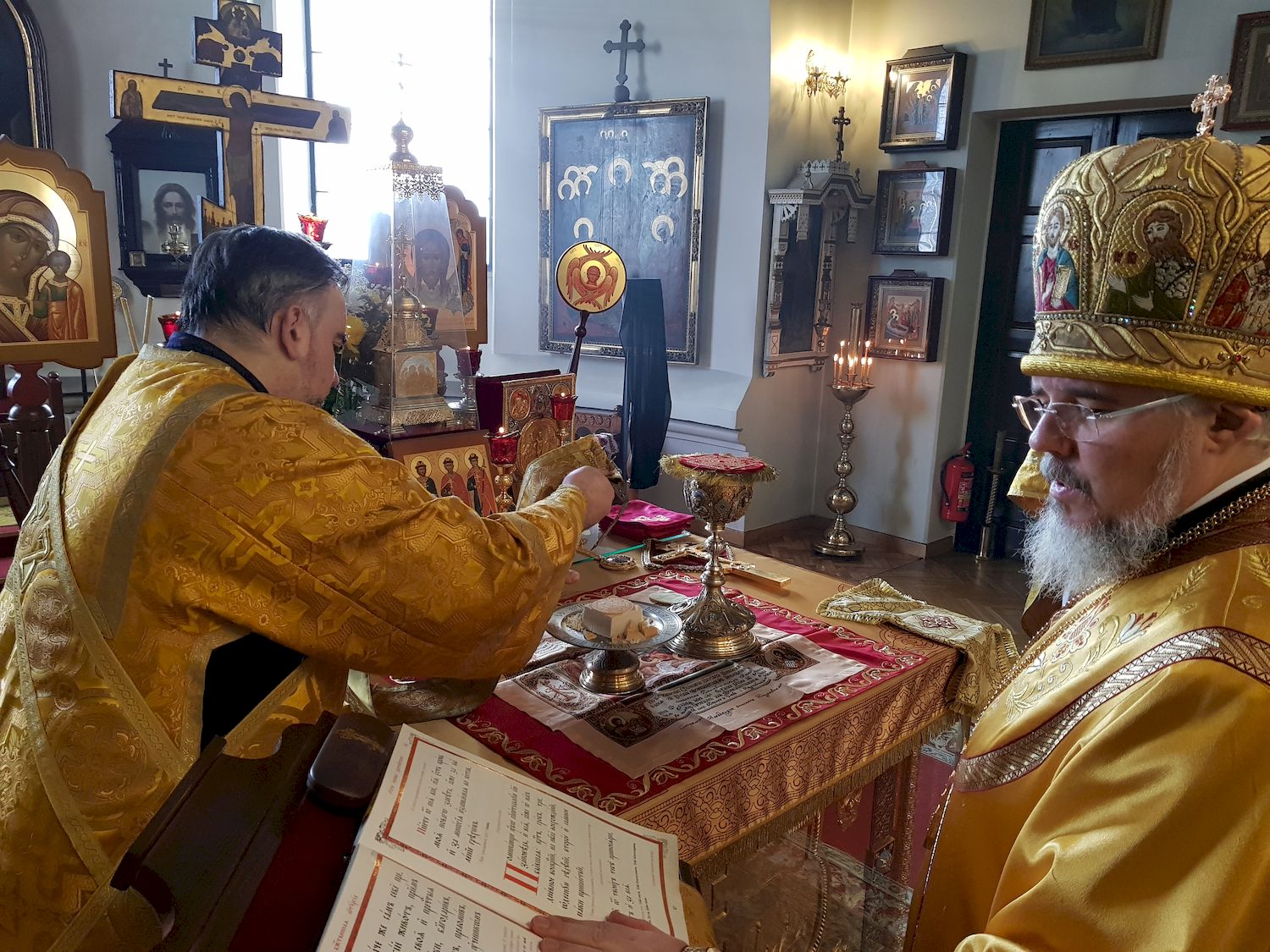 За Божественной литургией Владыке Александру сослужили клирики кафедрального собора: и.о. благочинного Даугавпилсского округа и ключаря собора иерей Павел Ткаченко, и.о. секретаря Даугавпилсско-Резекненской епархии иеромонах Александр (Лизон), диакон Роман Смирнов и диакон Сергий Меньков.