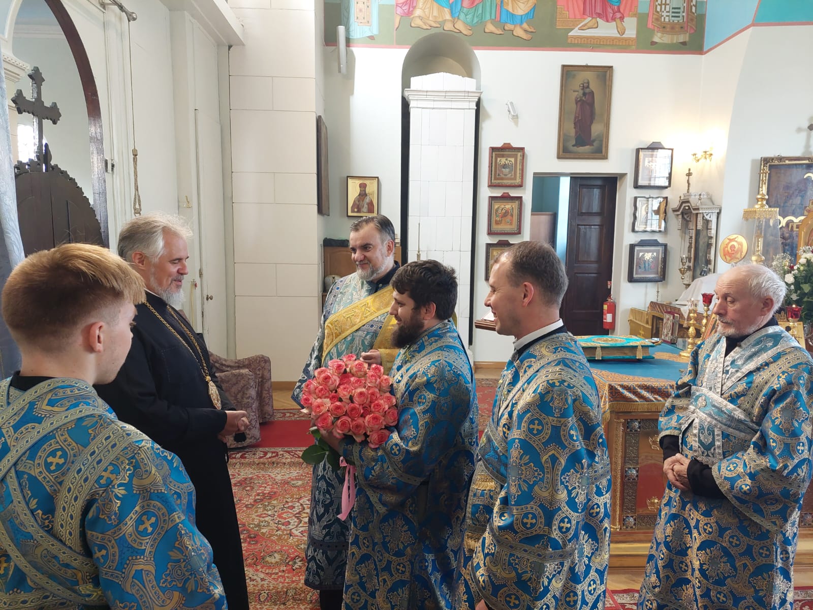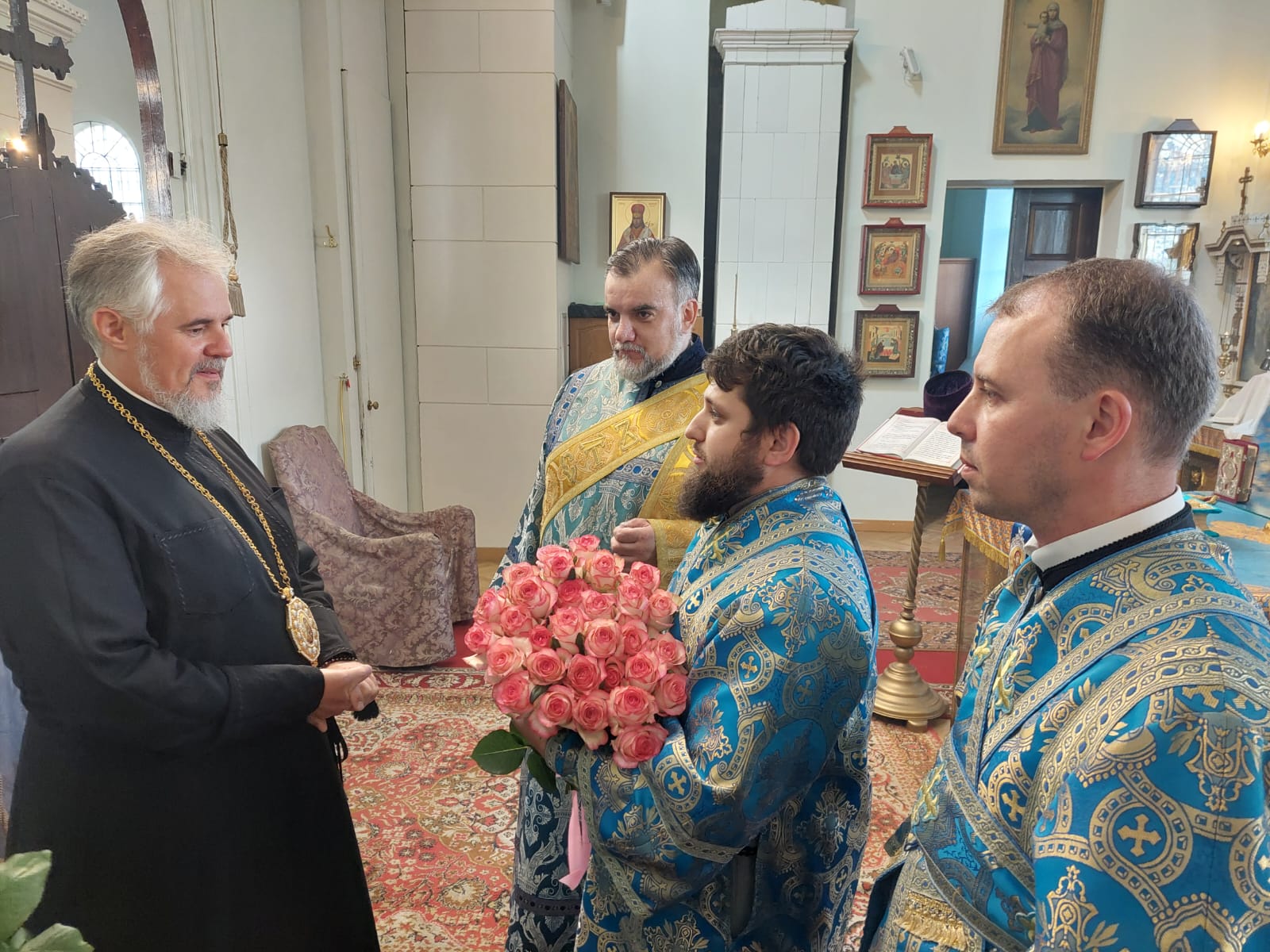 Затем духовенство епархии поздравило Его Высокопреосвященство с прошедшим днём архиерейской хиротонии, который Архипастырь Латгальского края молитвенно отметил в день Преображения Господня — 19 августа — в Спасо-Преображенской пустыни. Поздравительный адрес огласил секретарь Даугавпилсско-Резекненской епархии архимандрит Спиридон (Сергеев), а отцы благочинные – иерей Павел Ткаченко, протоиерей Виктор Теплов и протоиерей Михаил Аршвила поднесли в дар Владыке от имени всего духовенства епархии комплект орлецов для Архиерейского служения и букет белых роз. Поблагодарив за поздравление и памятные дары, Владыка Александр преподал своё общее благословение.