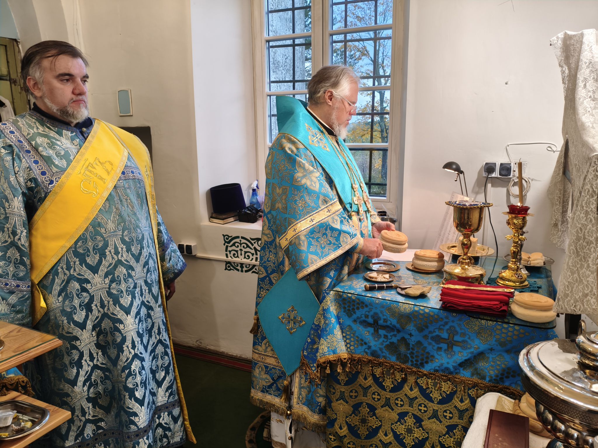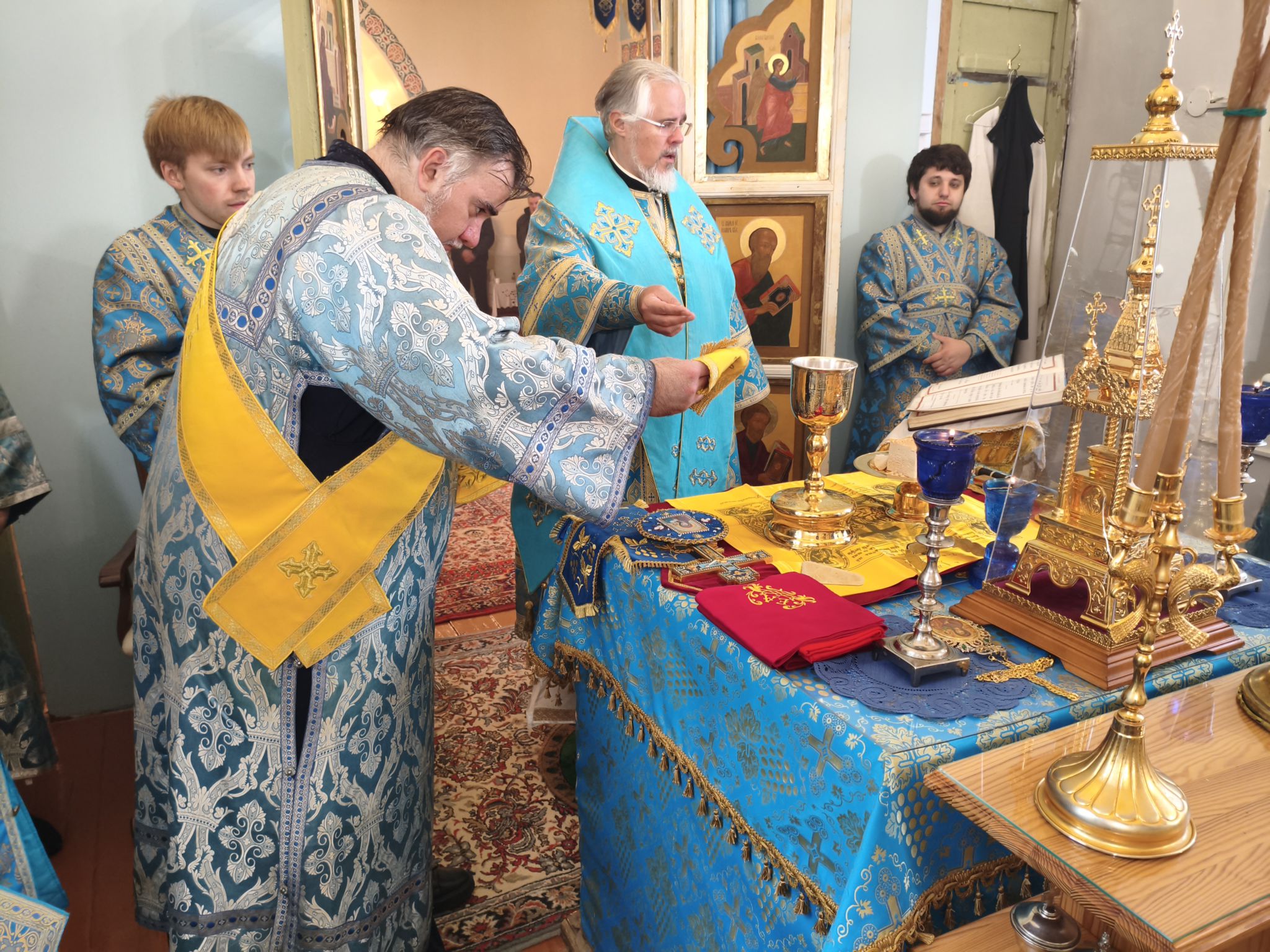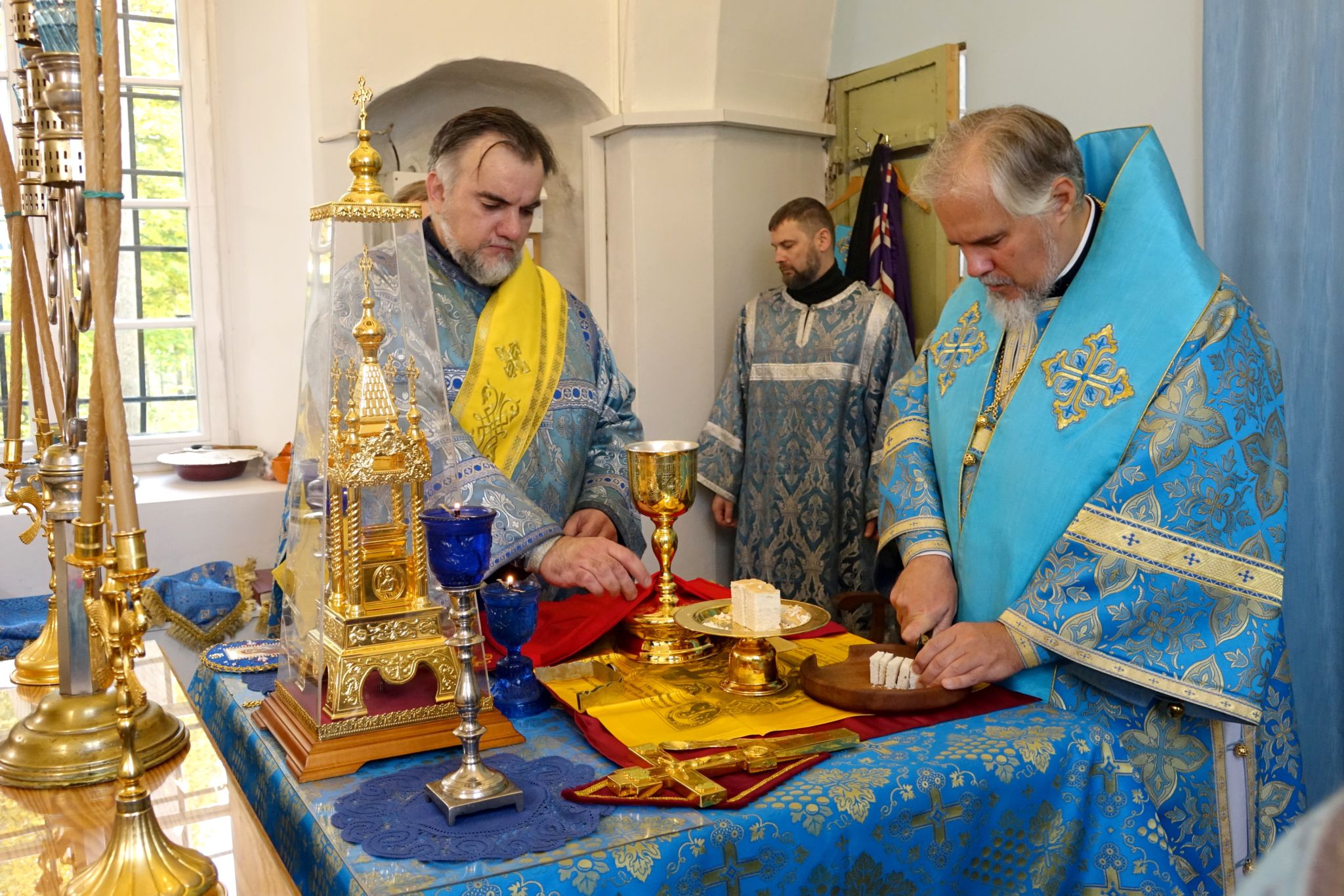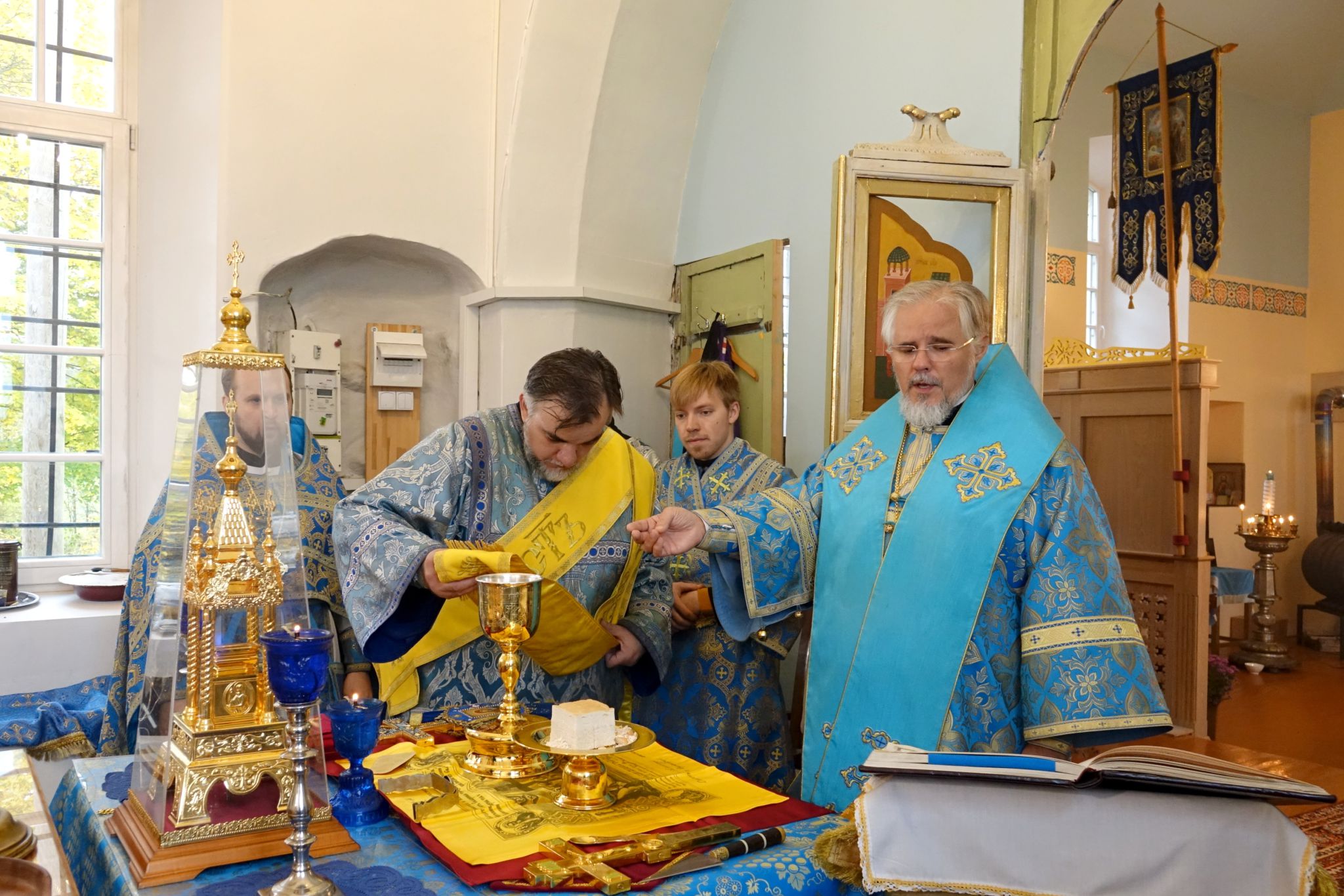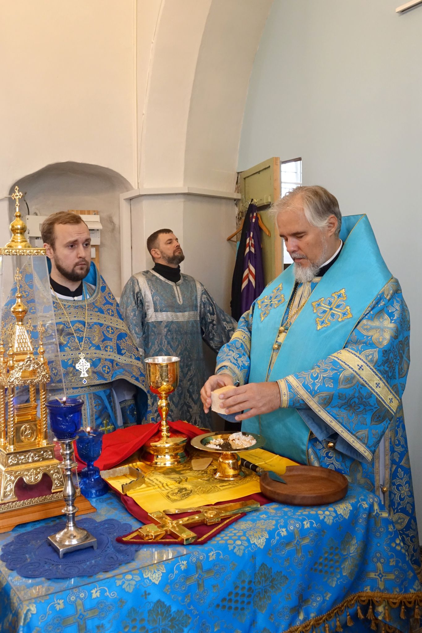 На богослужении читалось Евангелие от Луки (Лк., зач. 54 — Лк. 10:38–42; 11:27–28.) Этот отрывок соединяет два евангельских образа: дом в Вифании, где Марфа заботится об угощении, а Мария с вниманием внимает слову Христову, и ответ Спасителя на восклицание женщины из народа: «Блаженна чрево, носившее Тебя…» — «Блаженны слышащие слово Божие и соблюдающие его».