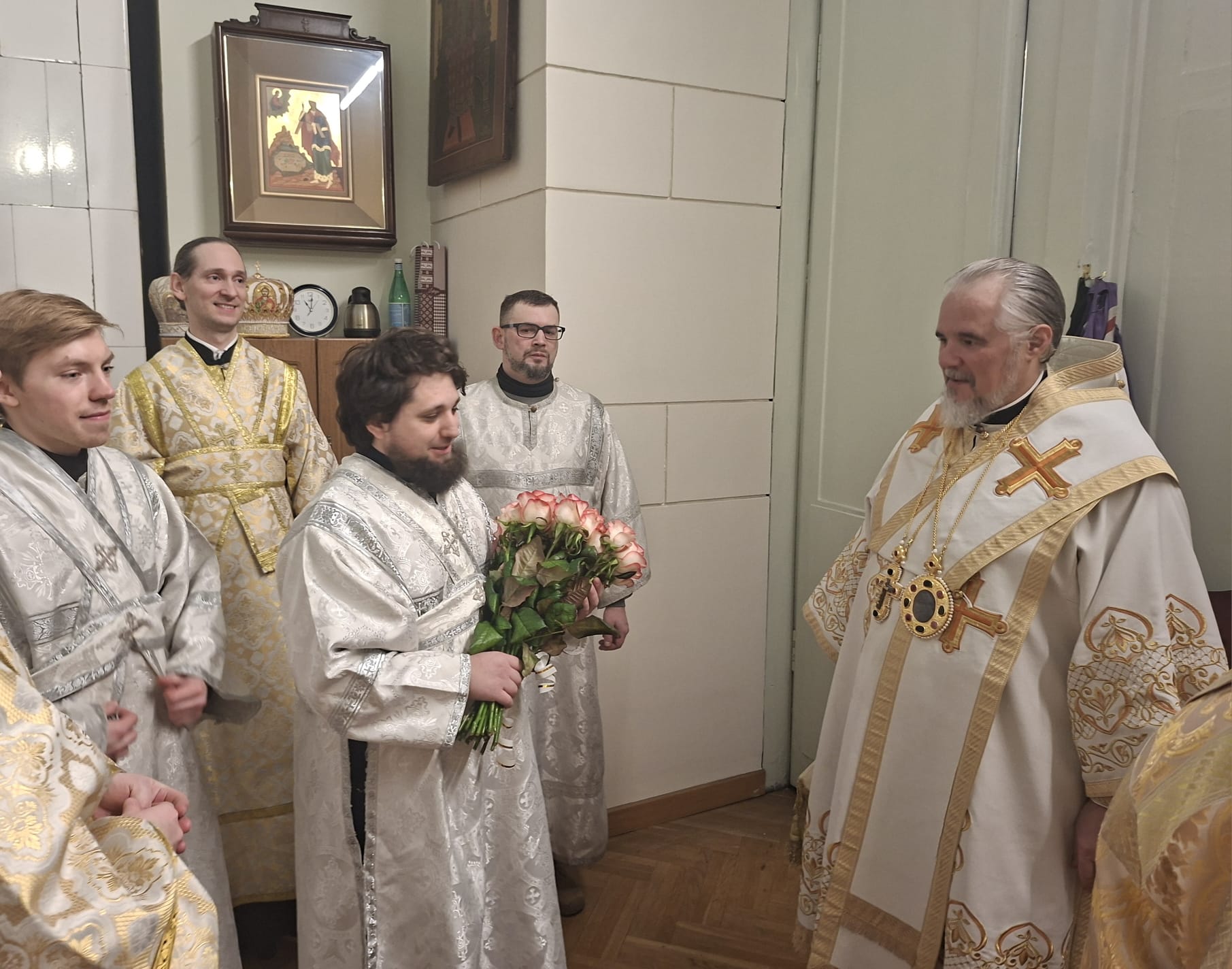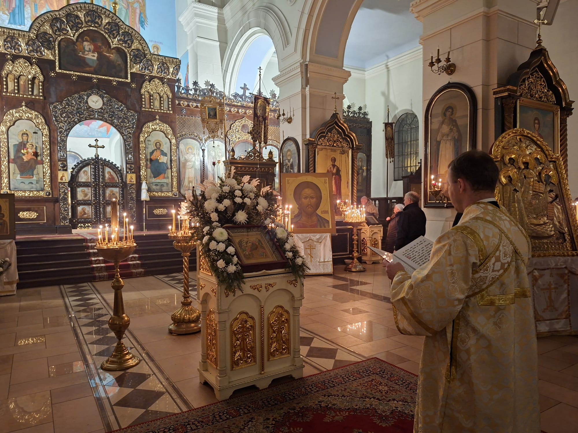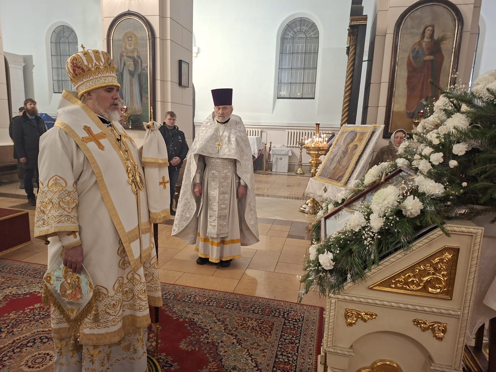На всенощном бдении Высокопреосвященнейшему Владыке сослужили: духовенство кафедрального собора — ключарь Борисоглебского собора, благочинный Даугавпилсского округа священник Павел Ткаченко, священники Андрей Ярыгин и Валерий Тихонов. Диаконский чин возглавил клирик Рижской епархии диакон Александр Акатов. За Божественной литургией архипастырю сослужили священник Павел Ткаченко, священник Андрей Ярыгин и диакон Александр Акатов.