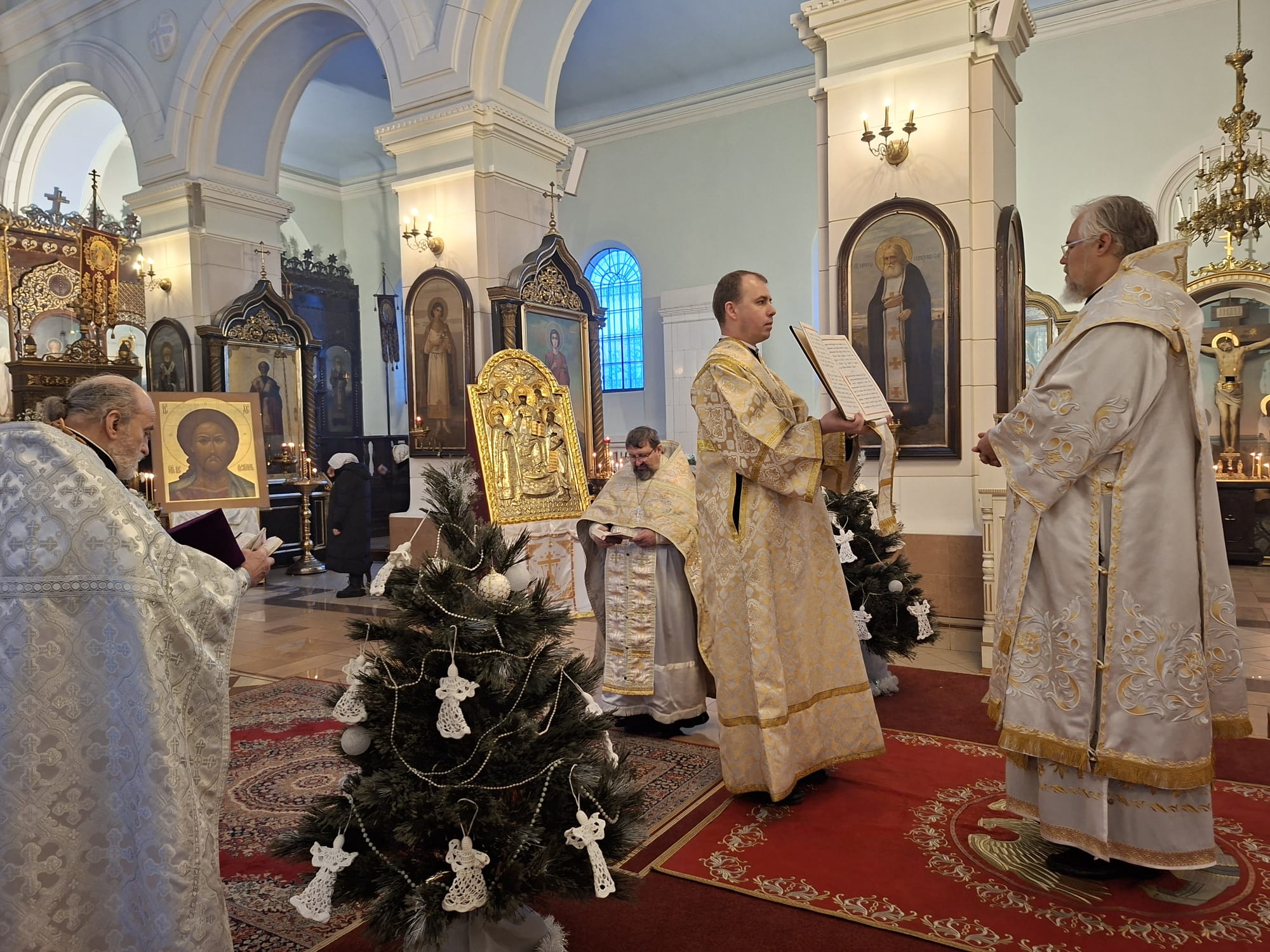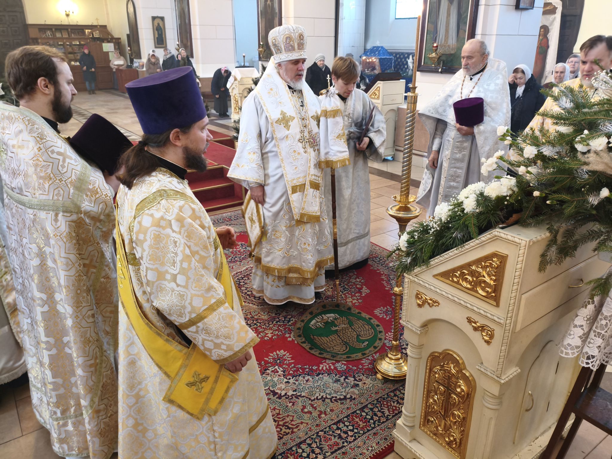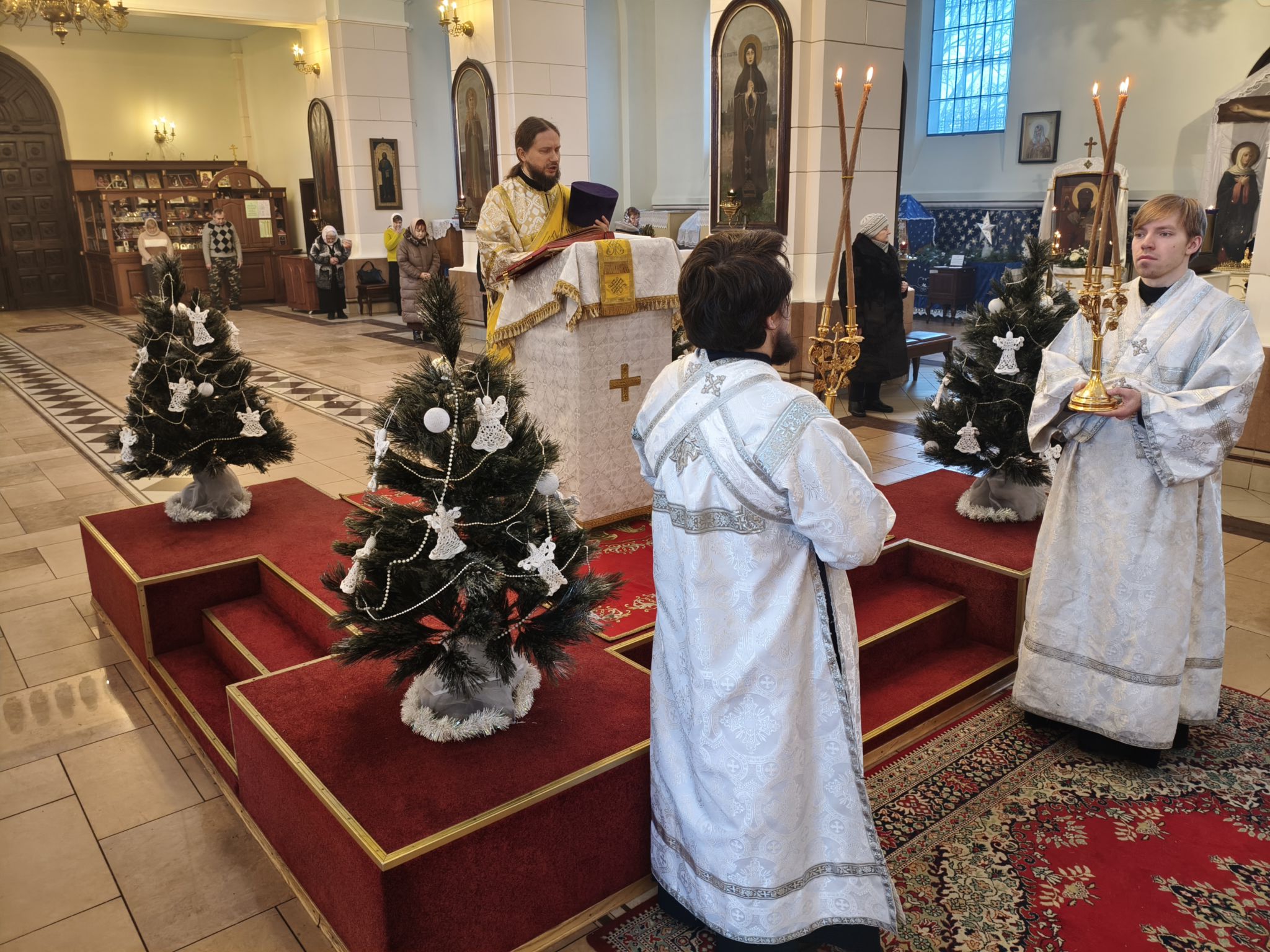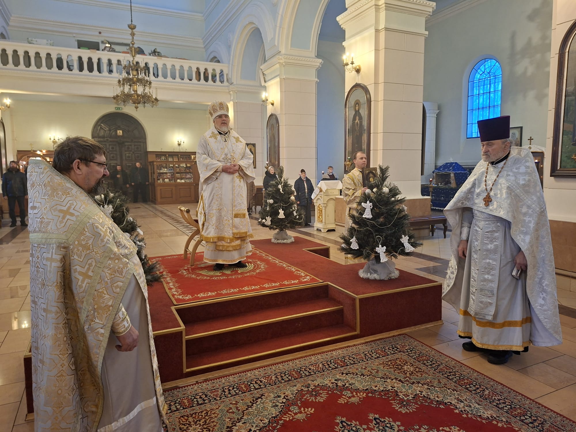 По окончании богослужения духовенство во главе с Высокопреосвященнейшим Владыкой Александром у праздничной иконы Рождества Христова и рождественской свечи, символизирующей Вифлеемскую звезду, совершило славление, во время которого были пропеты тропарь и кондак празднику Рождества Христова.
