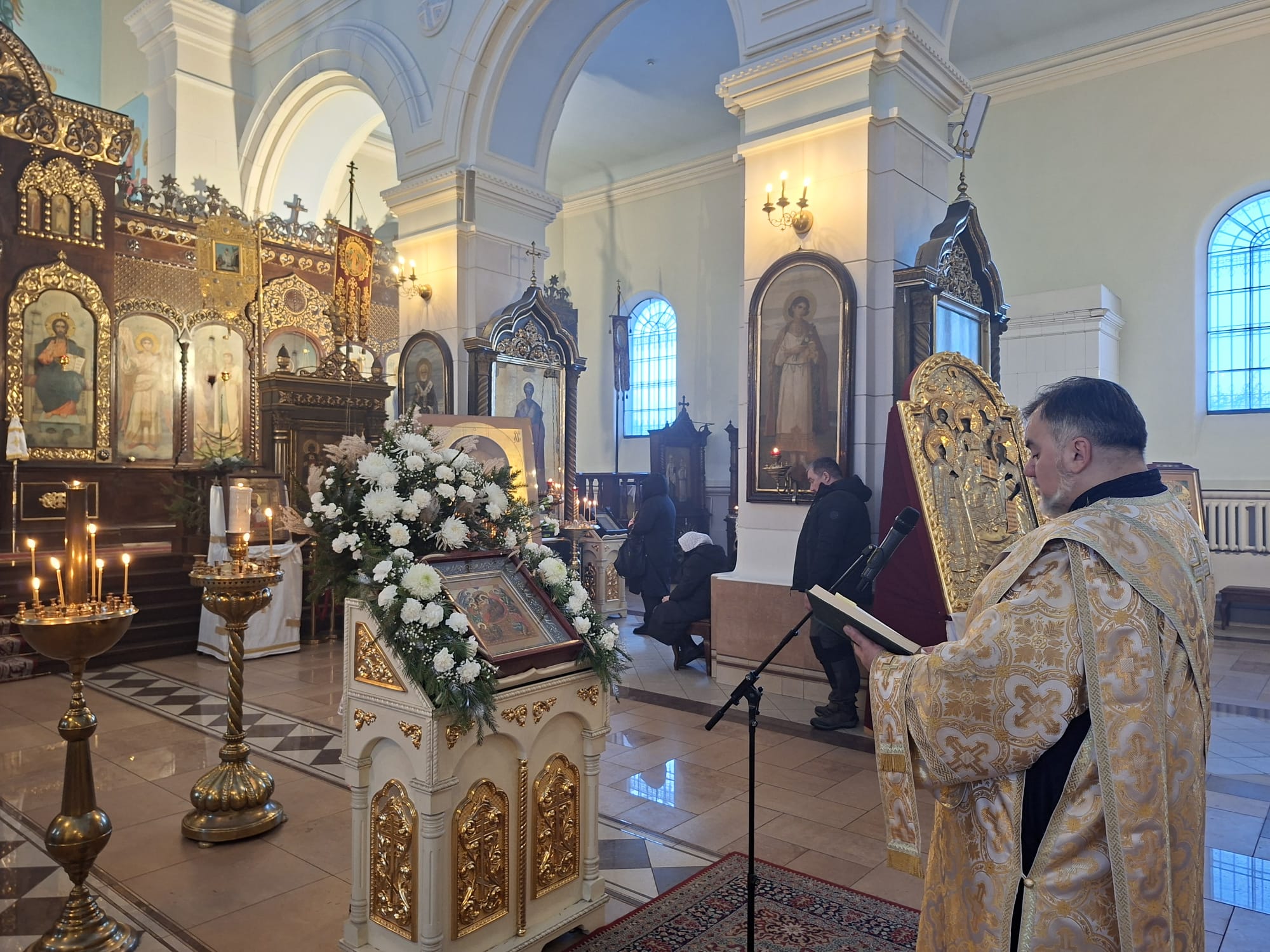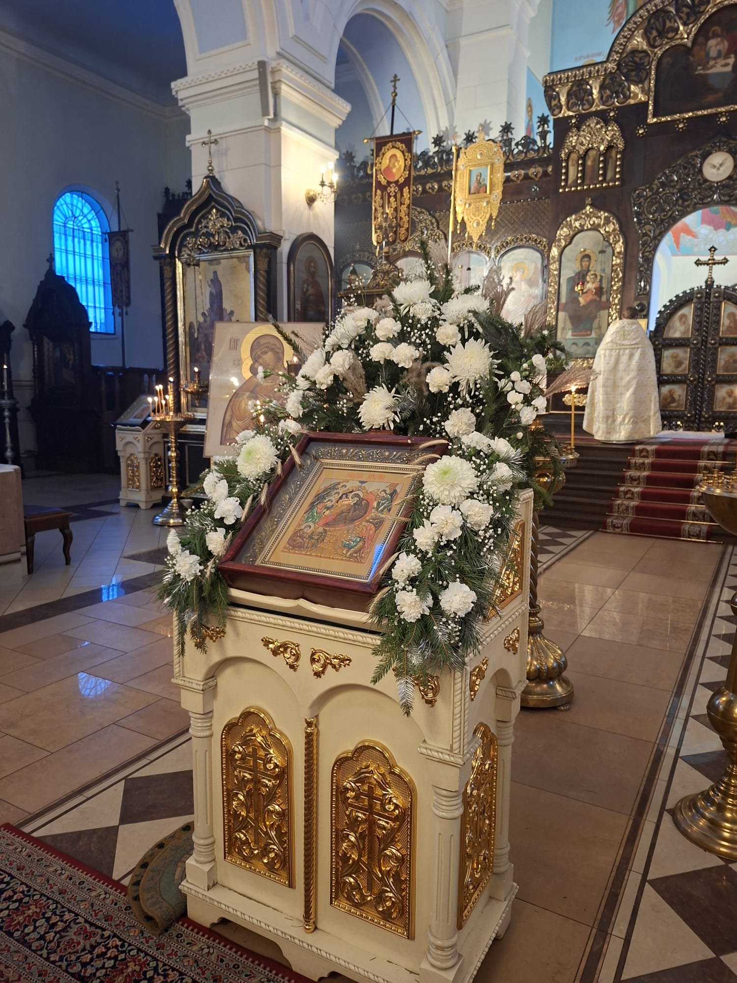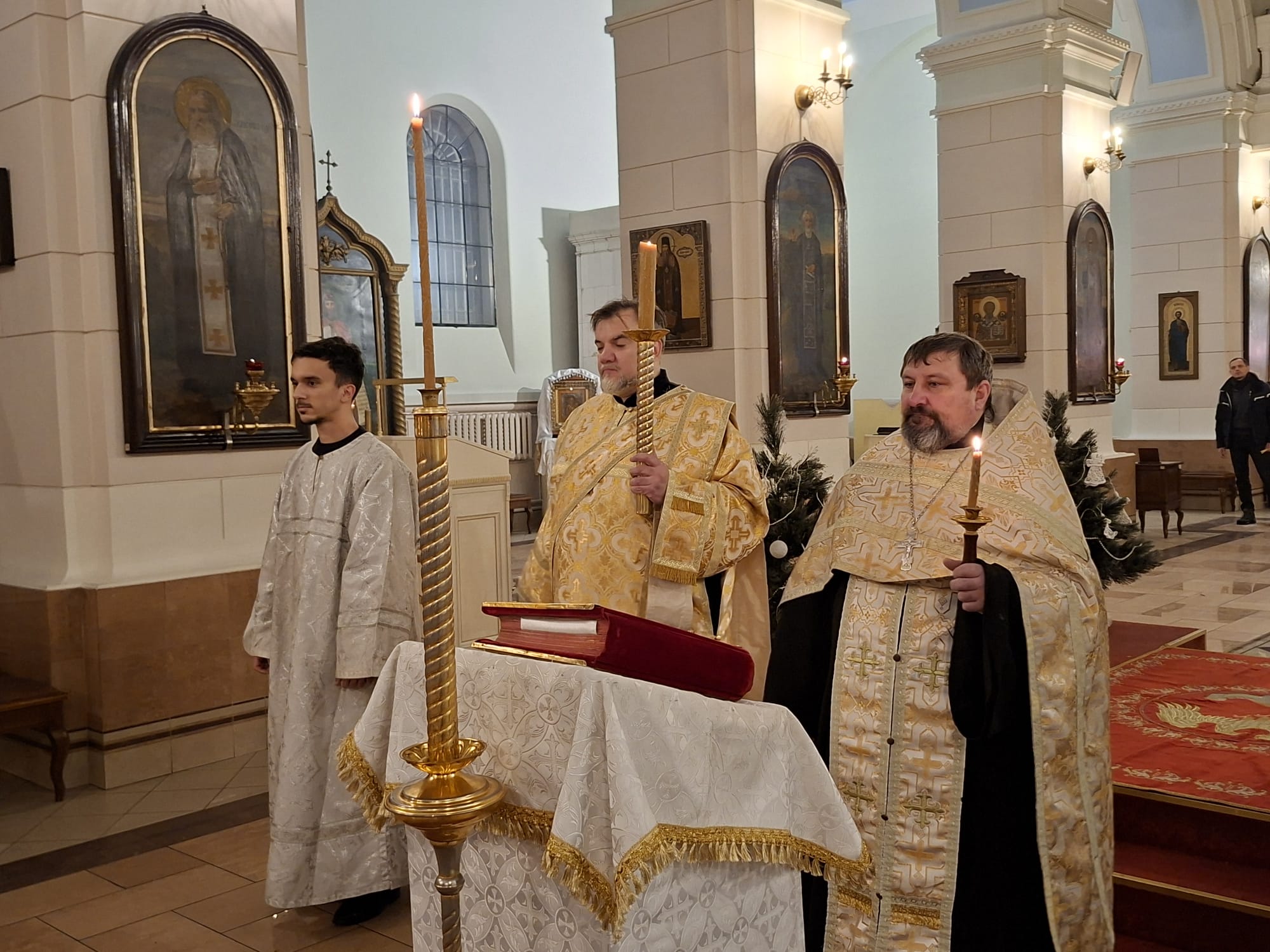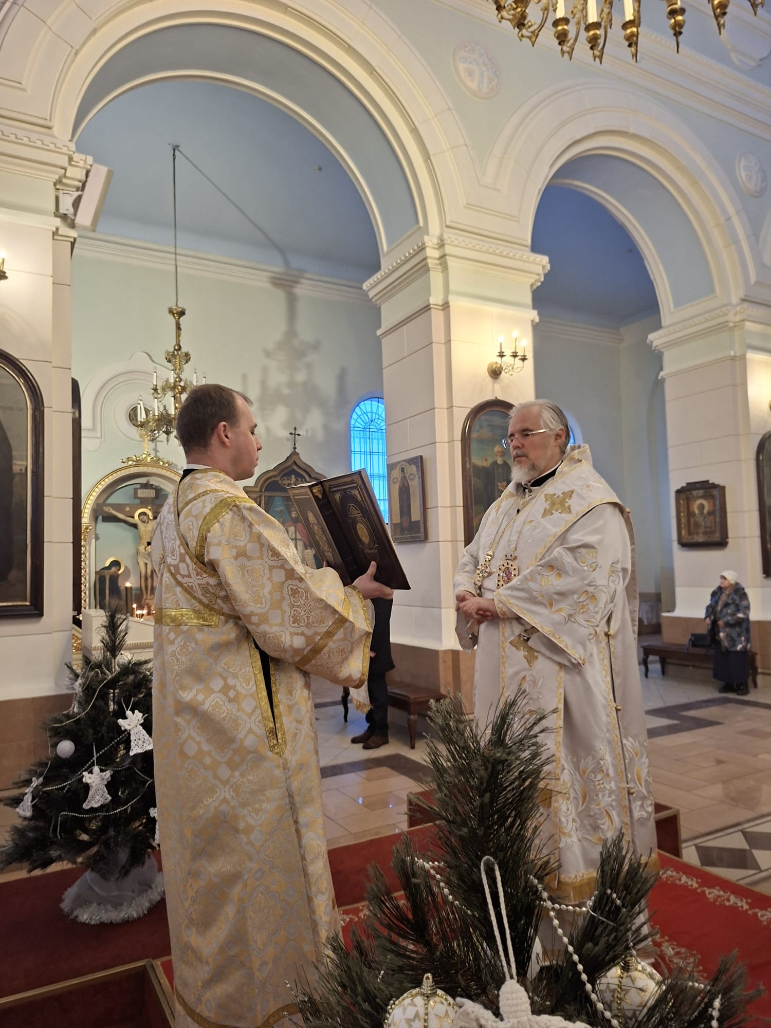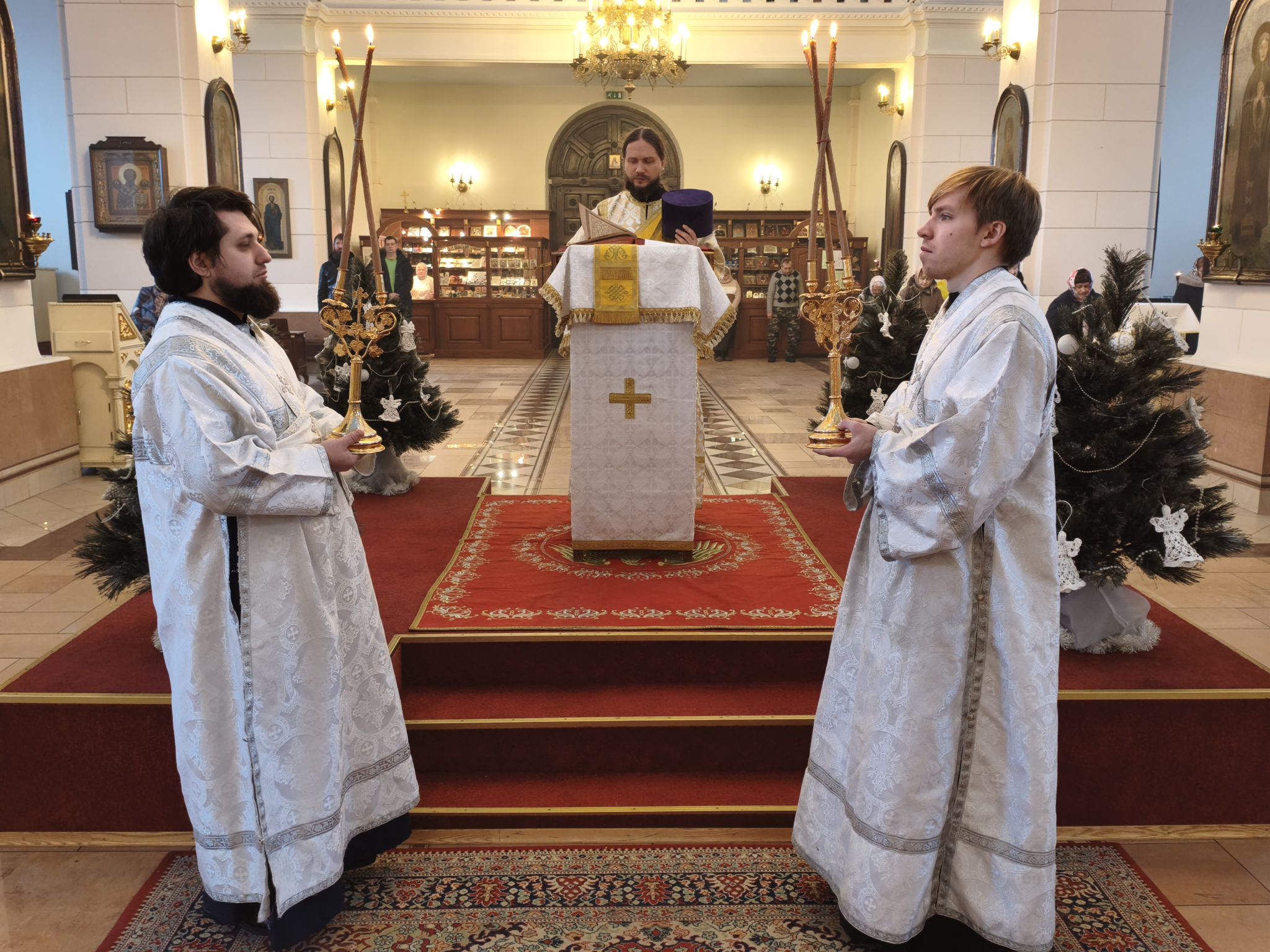 По окончании богослужения духовенство во главе с Высокопреосвященнейшим Владыкой Александром у праздничной иконы Рождества Христова и рождественской свечи, символизирующей Вифлеемскую звезду, совершило славление, во время которого были пропеты тропарь и кондак празднику Рождества Христова.