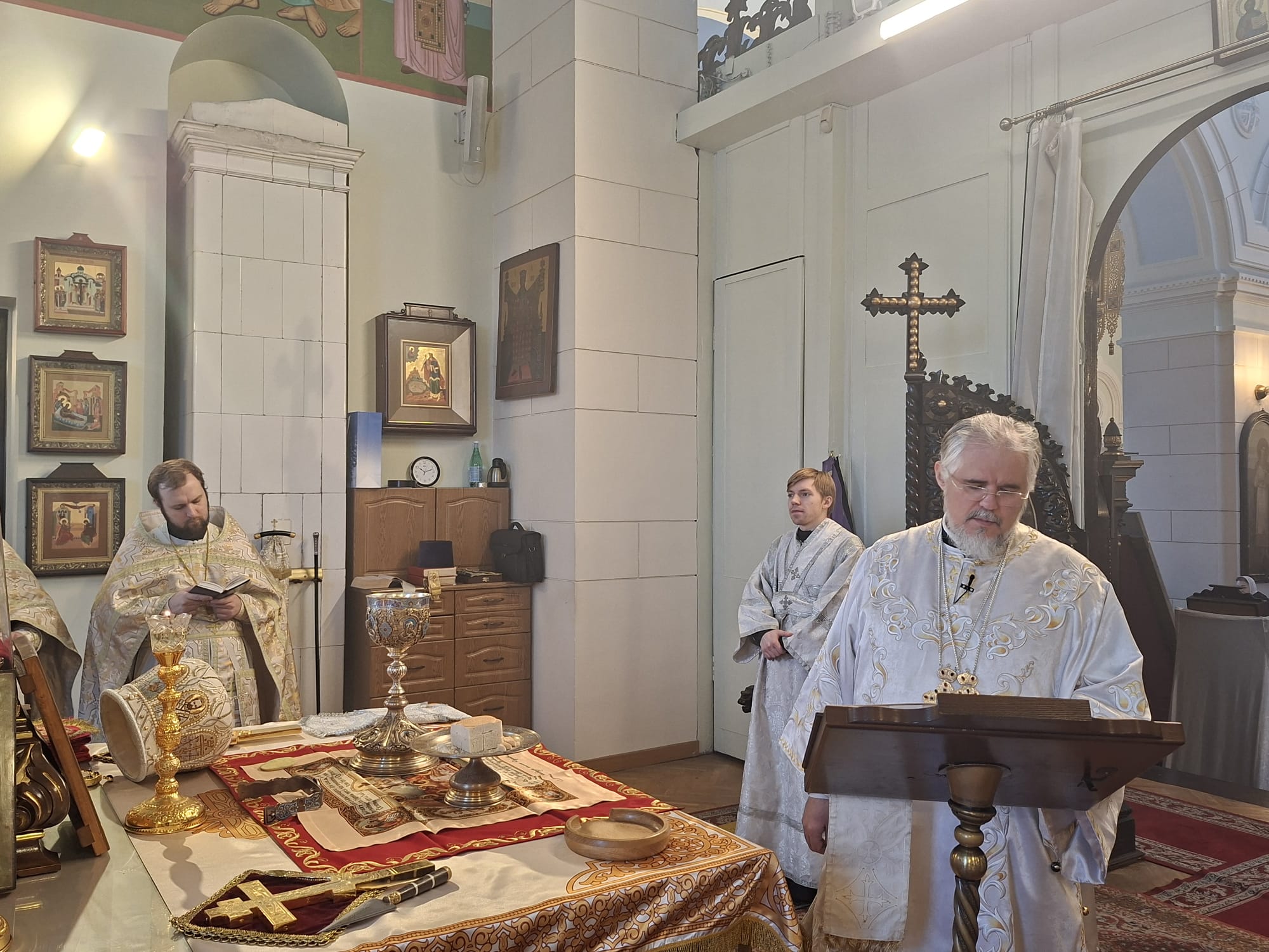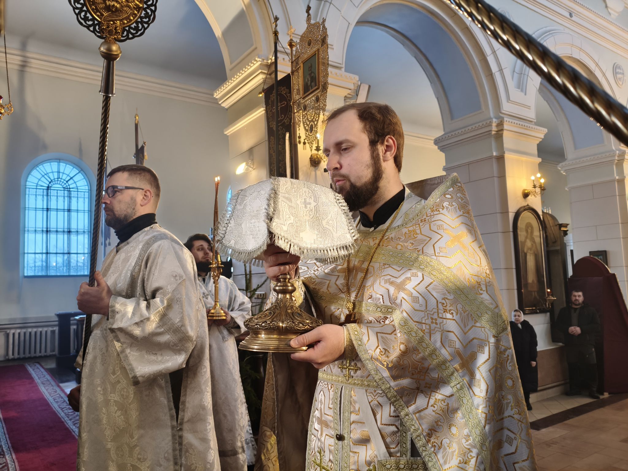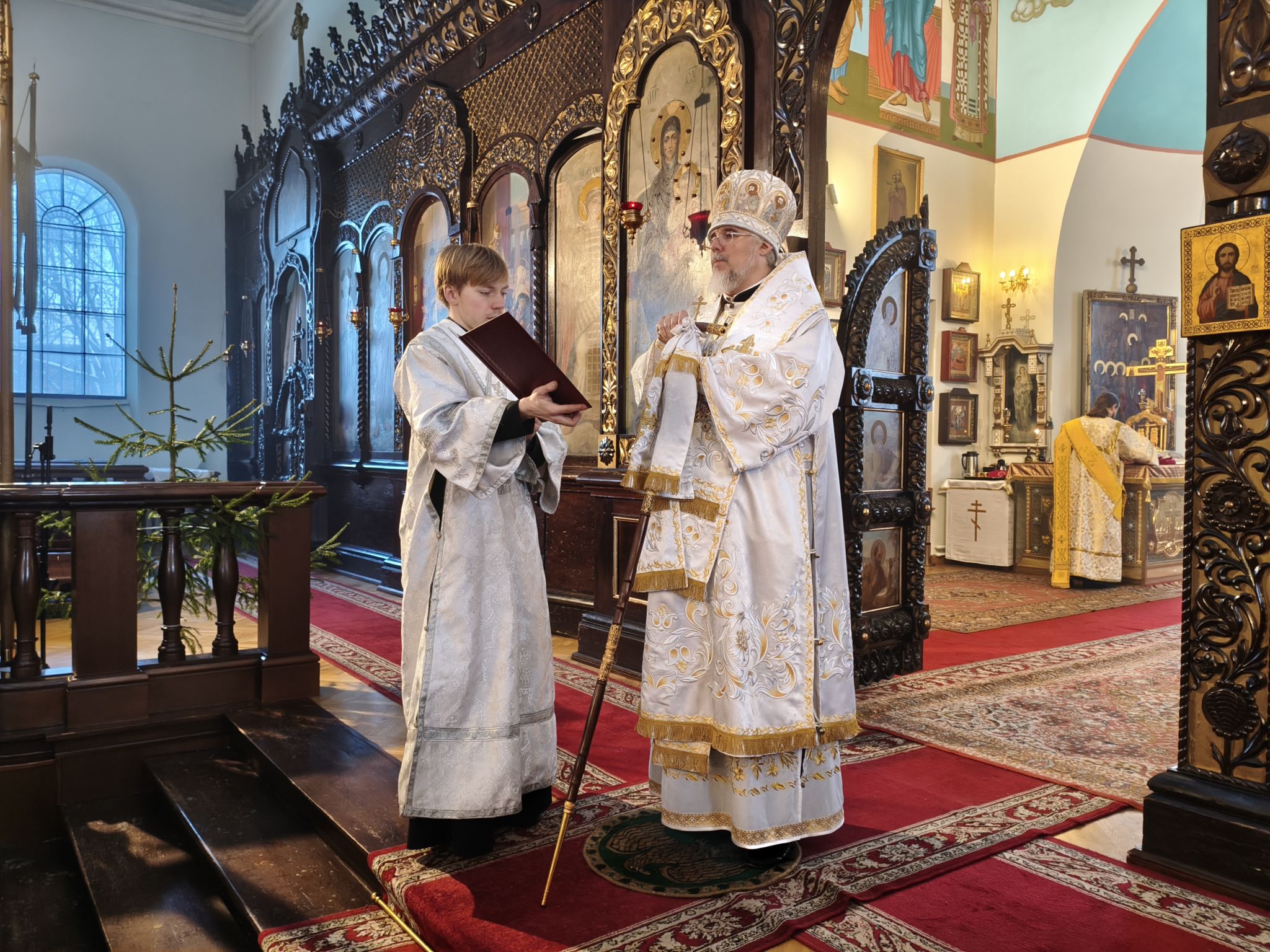 Его Высокопреосвященству сослужили: ключарь Борисоглебского собора, благочинный Даугавпилсского округа священник Павел Ткаченко, клирики собора священники Андрей Ярыгин и Валерий Тихонов, клирик Рижской епархии диакон Александр Акатов и штатный диакон собора Роман Смирнов.