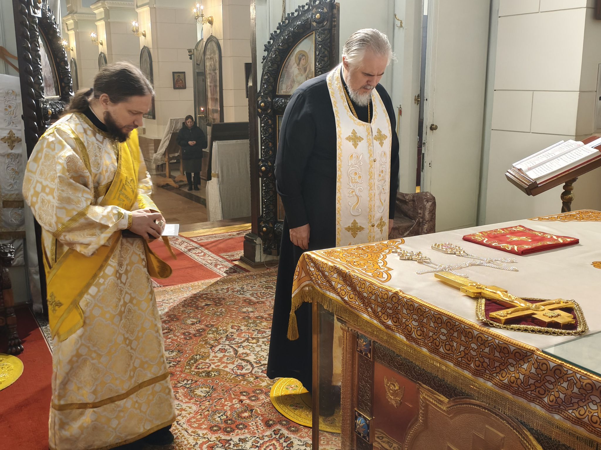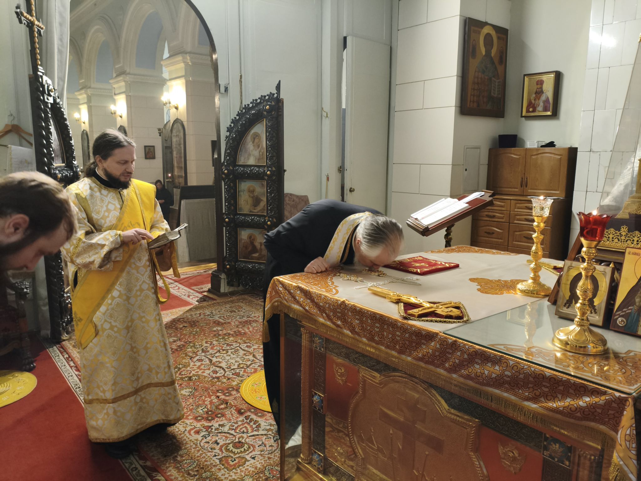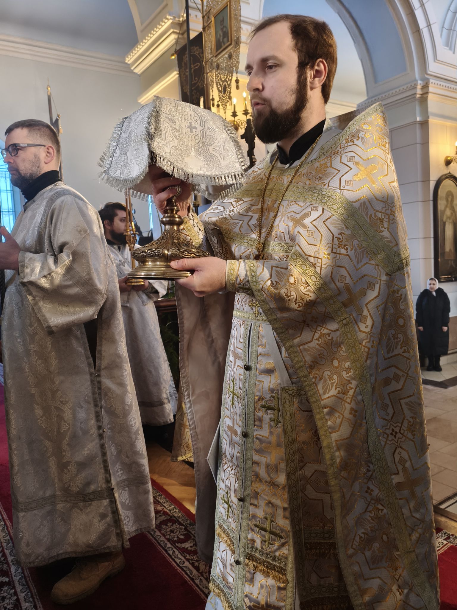 Его Высокопреосвященству сослужили: ключарь Борисоглебского собора, благочинный Даугавпилсского округа священник Павел Ткаченко, клирики собора священники Андрей Ярыгин и Валерий Тихонов, клирик Рижской епархии диакон Александр Акатов и штатный диакон собора Роман Смирнов.
