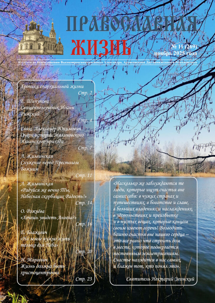 В ноябре дни становятся ещё короче, небо всё чаще хмурится, и начинают веять зимние холода. Улететь бы в тёплые края вслед за перелётными птицами, покинувшими наши суровые широты! Однако человека согревает не только физическое тепло. На первую страницу обложки ноябрьского номера журнала «Православная жизнь» за 2025 год вынесены слова православного святого нового времени святителя Нектария Эгинского: «Насколько же заблуждаются те люди, которые ищут счастья вне самих себя: в чужих странах и путешествиях, в богатстве и славе, в удовольствиях и преизбытке и в пустых вещах, которые концом своим имеют горечь! Счастье находится в нас самих, и блажен тот, кто понял это».